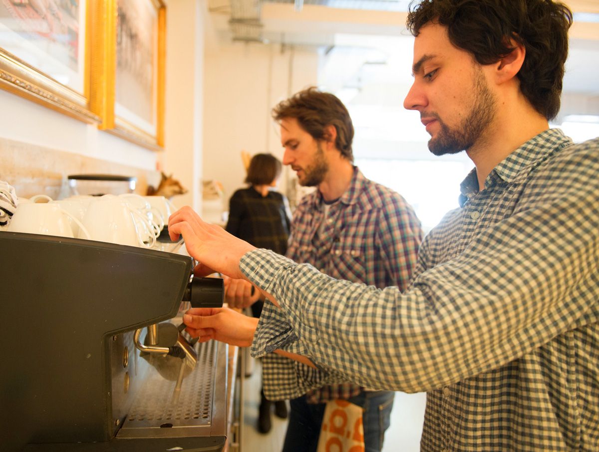 This was no amateur coffee shop. We had proper branded takeaway cups, printed aprons, an incredible range of homemade cakes and a resident graphic artist in the window. Our baristas, Jamie and Alex, delivered some real latte art.