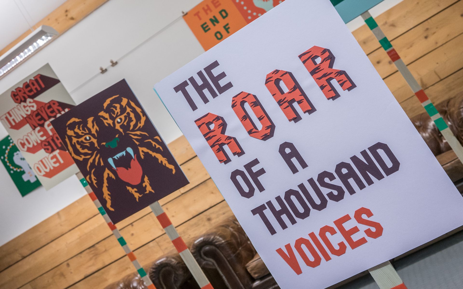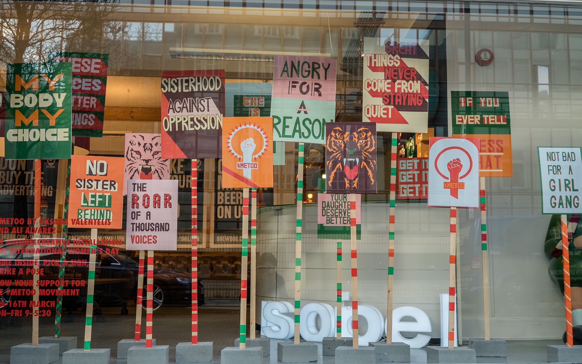 Their punchy protest signs drew lots of attention from the street and at last night’s private view, with people picking them up and striking poses left, right and centre.