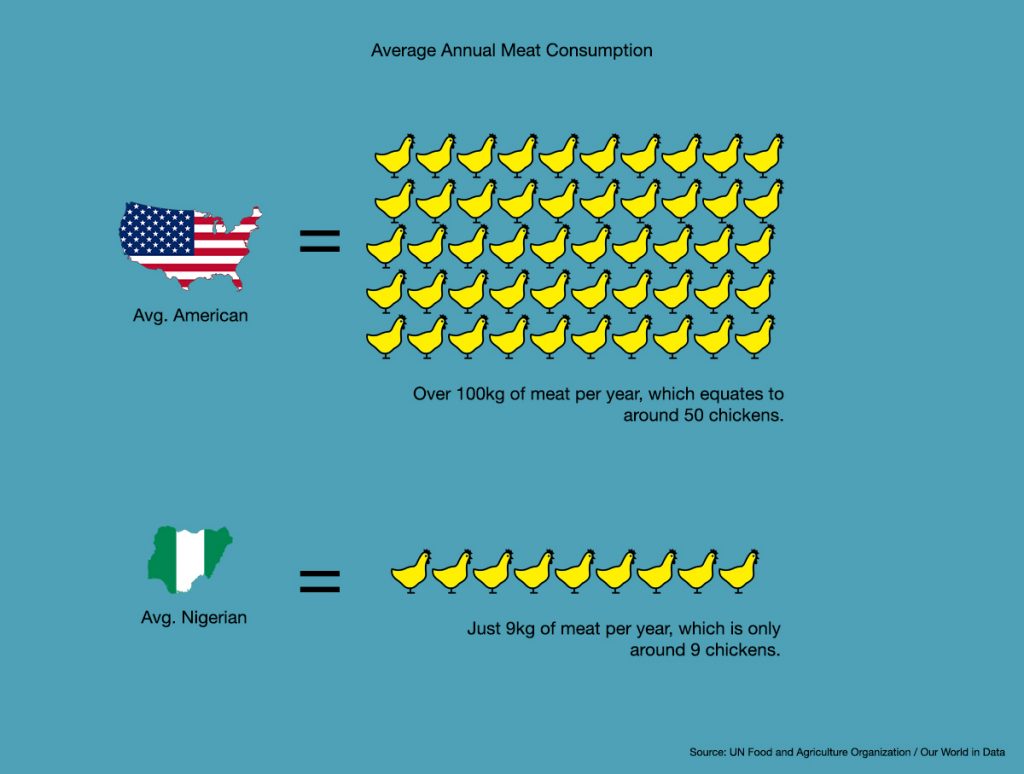 Lots of other countries haven’t yet reached the level of economic growth required to produce industrialised levels of meat, but have seen their populations grow massively. Nigeria, for instance, is on track to overtake the population of the US by the 2050s, and before the end of the century, the population of Europe. If its economy catches up with its population trend, it’ll play a vital part in making Africa the next biggest producer of meat. As things stand, they’re way behind the world’s top consumers.